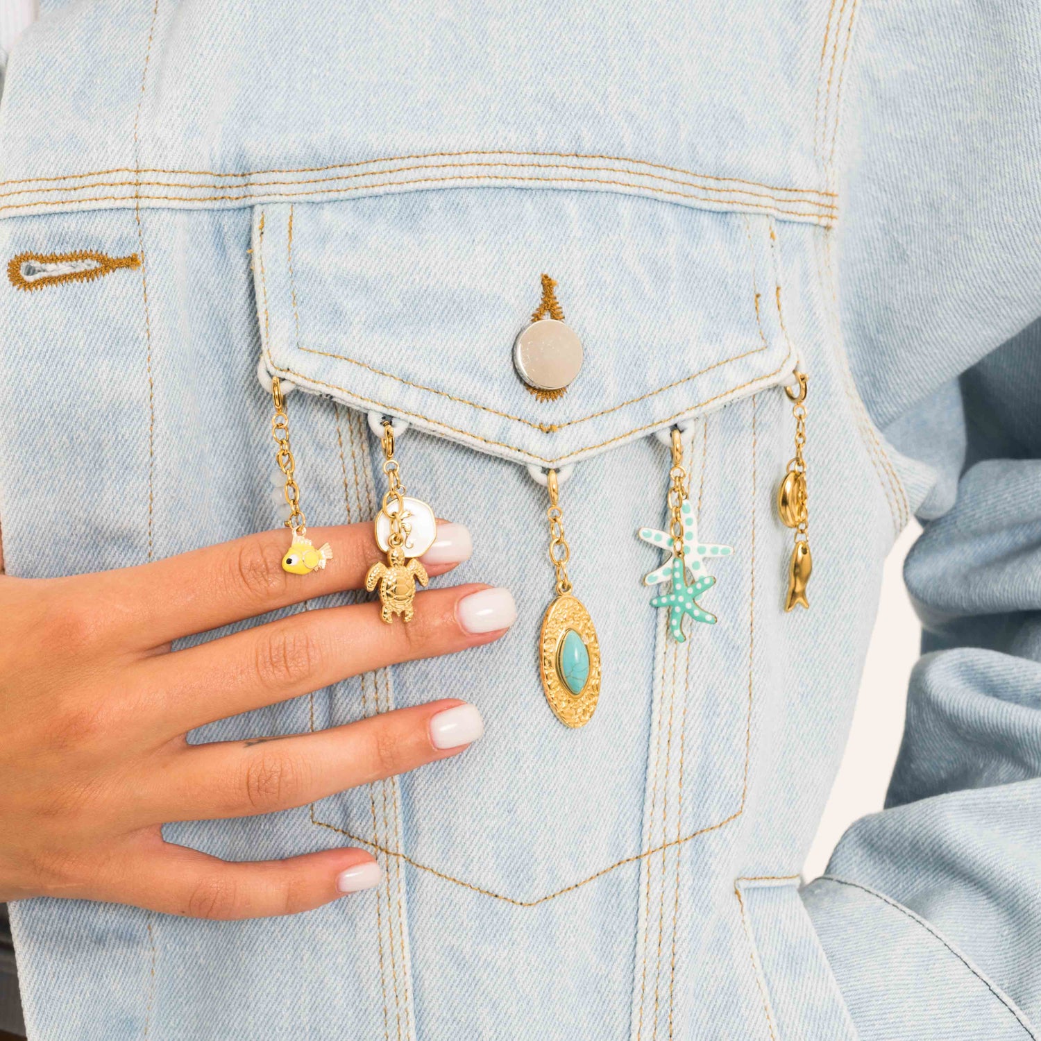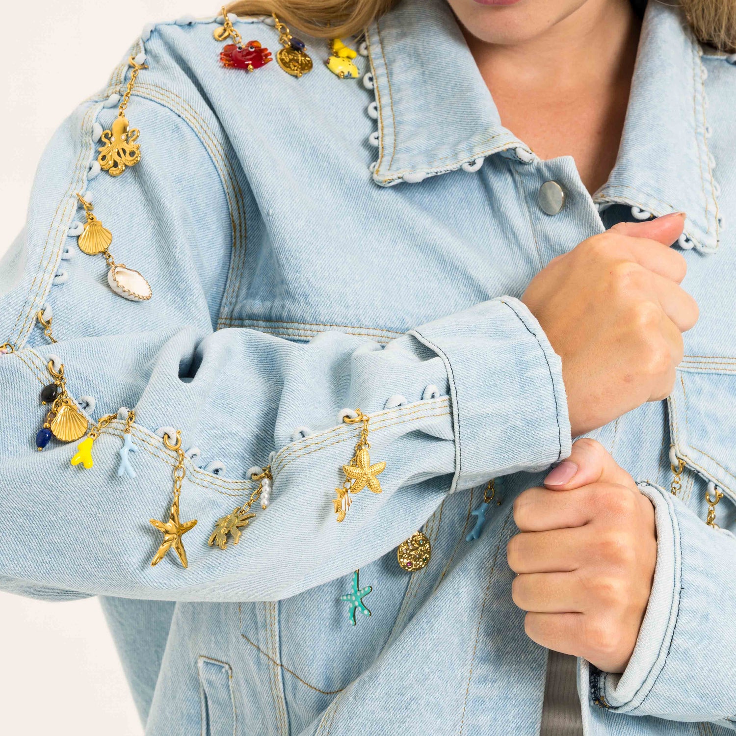 Turn your Hukdd Oversized Denim Jacket into a unique piece with brass charms—clip on for instant personalization. Mix from the Under The Sun Collection for any vibe.