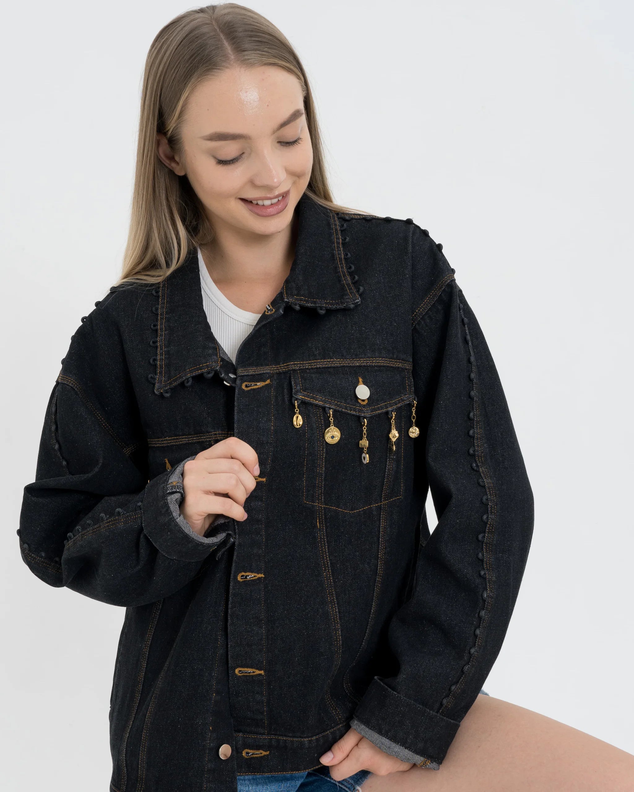 Our Oversized Denim Jackets come with charm hanging loops everywhere—front, back, sleeves, and hem—so you can clip on charms and show your true individuality.